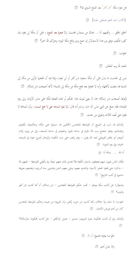 والسؤال؛ هل كانت مكة يومئذٍ – تحت حكم القرامطة الملحدين – دار إسلام، أم أنها كانت دار كفر وحرب؟