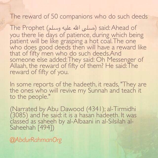 Abu Tha’labah reported: The Messenger of Allah, peace and blessings be upon him, said, “Rather, you must enjoin good and forbid evil until you see greed being obeyed, desires being followed, worldly life being preferred, and everyone is impressed by their own opinion. Then you must take care of yourself and leave the common people. Verily, ahead of you are days of patience in which patience will be like grasping a hot coal. The one who does good deeds in that time will have the reward of fifty men who do likewise.”