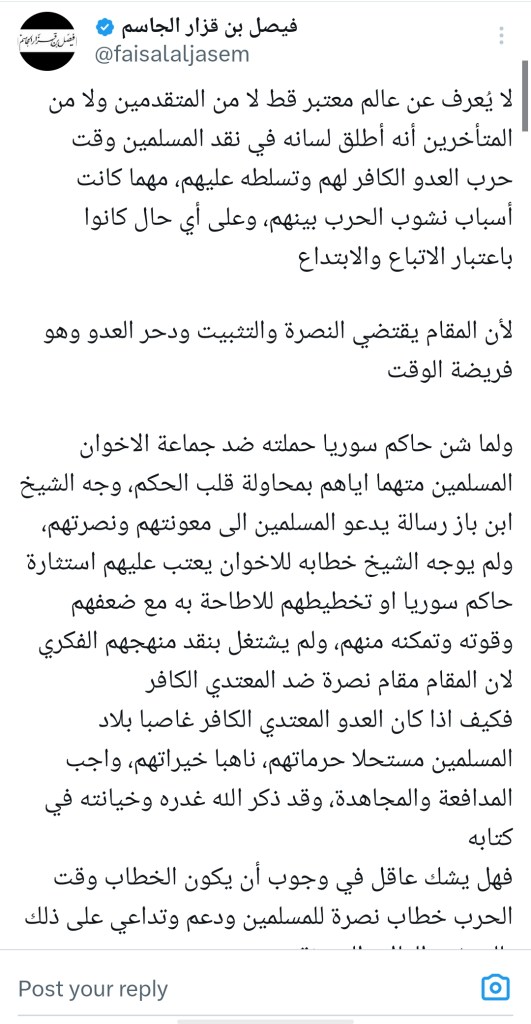 It was never known of any reliable scholar (‘Aalim) ever, either from the scholars of the past or from the contemporaries, that they used their tongues to critique the Muslims at a time when they were at war with a disbelieving enemy and were being overpowered (by the enemy), regardless of the reason for the war between them, and regardless of the condition of those Muslims, being followers of the Sunnah or followers of Bid’ah.