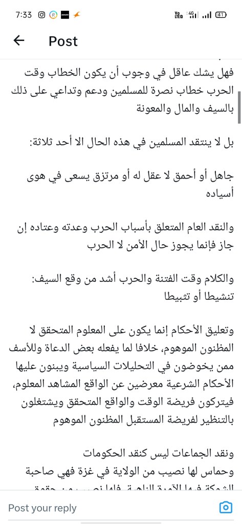 And Hamas holds a portion of authority in Gaza, being the authority with power there, and possessing a rightful share of guardianship. Hence, criticizing it carries the same weight as criticizing Islamic governments in Muslim countries. It is evident that this would be the most detrimental, repugnant, and detestable situation during times of war with the disbelievers.