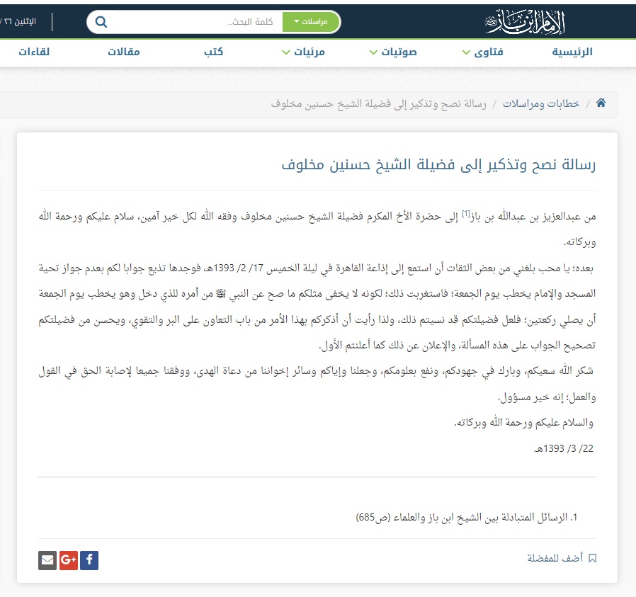 Title : A letter of advice and a reminder to his eminence Ash-Shaikh Hassanein Makhlouf from Shaikh Abdul Azeez bin Abdullah bin Baaz.