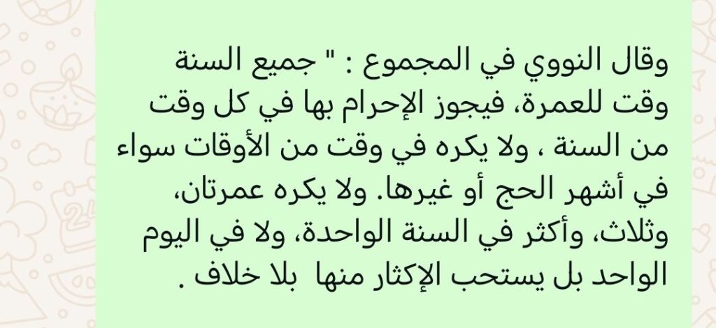 Also, performing two, three, or more Umrahs in one year, or even in one day, is not disliked. On the contrary, it is recommended to perform Umrah frequently, and there is no disagreement about this.” End quote.