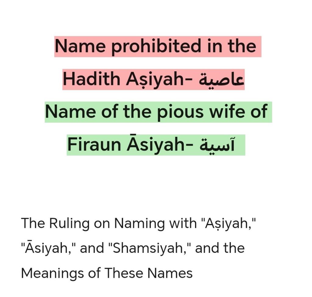 As for “‘Āṣiyah”: It comes from al-‘iṣyān (disobedience), which is the act of departing from obedience and violating a command. It is an ugly name. Indeed, Muslim (2139) narrated from Ibn ‘Umar: “The Messenger of Allah (peace be upon him) changed the name of ‘Āṣiyah and said: ‘You are Jamīlah (beautiful).'”