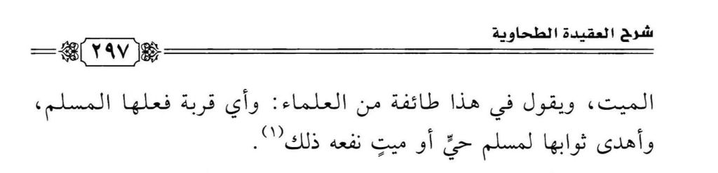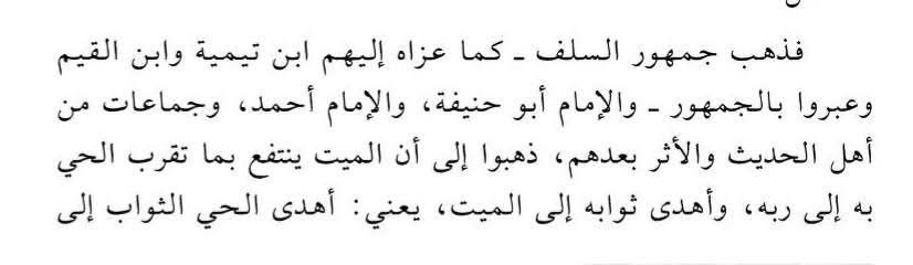 “The majority of the Salaf, as Ibn Taymiyyah and Ibn al-Qayyim attributed it to them, and they explicitly described them as “the majority”, along with al-Imām Abū Ḥanīfah, al-Imām Aḥmad, and groups from the Ahl al-Ḥadīth and Athar after them, held the view that the deceased benefits from what the living person draws near to his Lord with and then gifts its reward to the deceased; meaning that the living person gifts the reward to the deceased. A group of scholars say in this regard, whatever act of devotion a Muslim performs and gifts its reward to a Muslim, whether living or dead, it benefits him.”