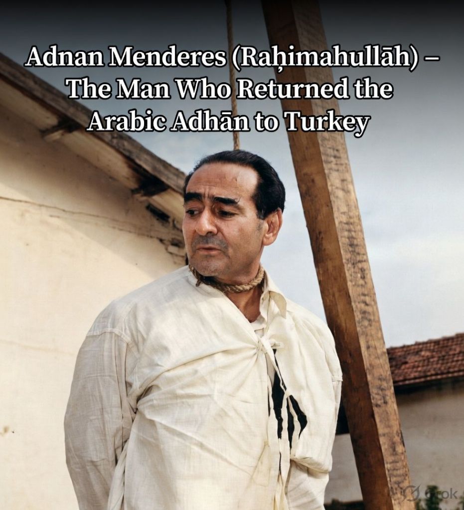 So remember this name well: Adnan Menderes. Remember him not only as the man through whom the Arabic Adhān returned to Turkey, though that alone would have been enough to make many believers love him. Remember him also as the orphan of Aydın, the young man of resistance, the veteran of the War of Independence, the parliamentarian who broke with a suffocating order, the founder of a new political path, the leader who understood the common people, the ruler who reopened doors for religion, the survivor of a plane crash who saw Allah’s favor in his survival, and the prisoner of Yassıada who ended on the gallows.