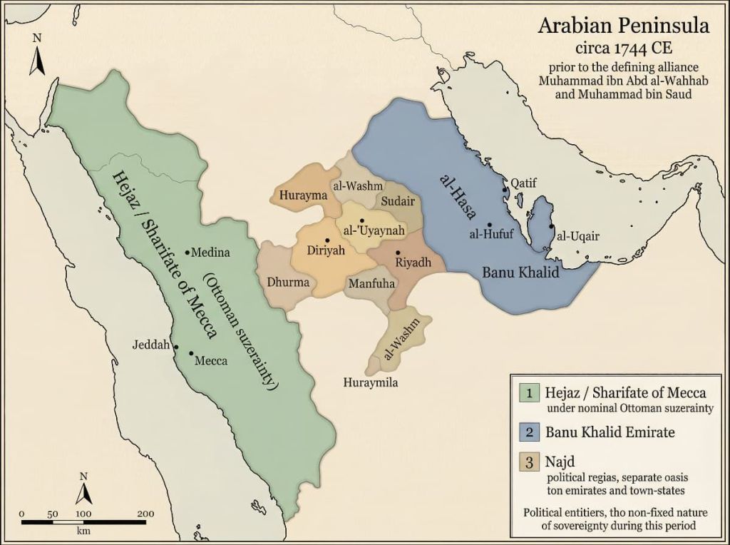 The State of Ad-Diriyyah, the small citydom of Aal-Saud in 1744 CE, when Muhammad bin Abdul Wahhab (Rahimahullah, born 1703 CE) began his Dawah.