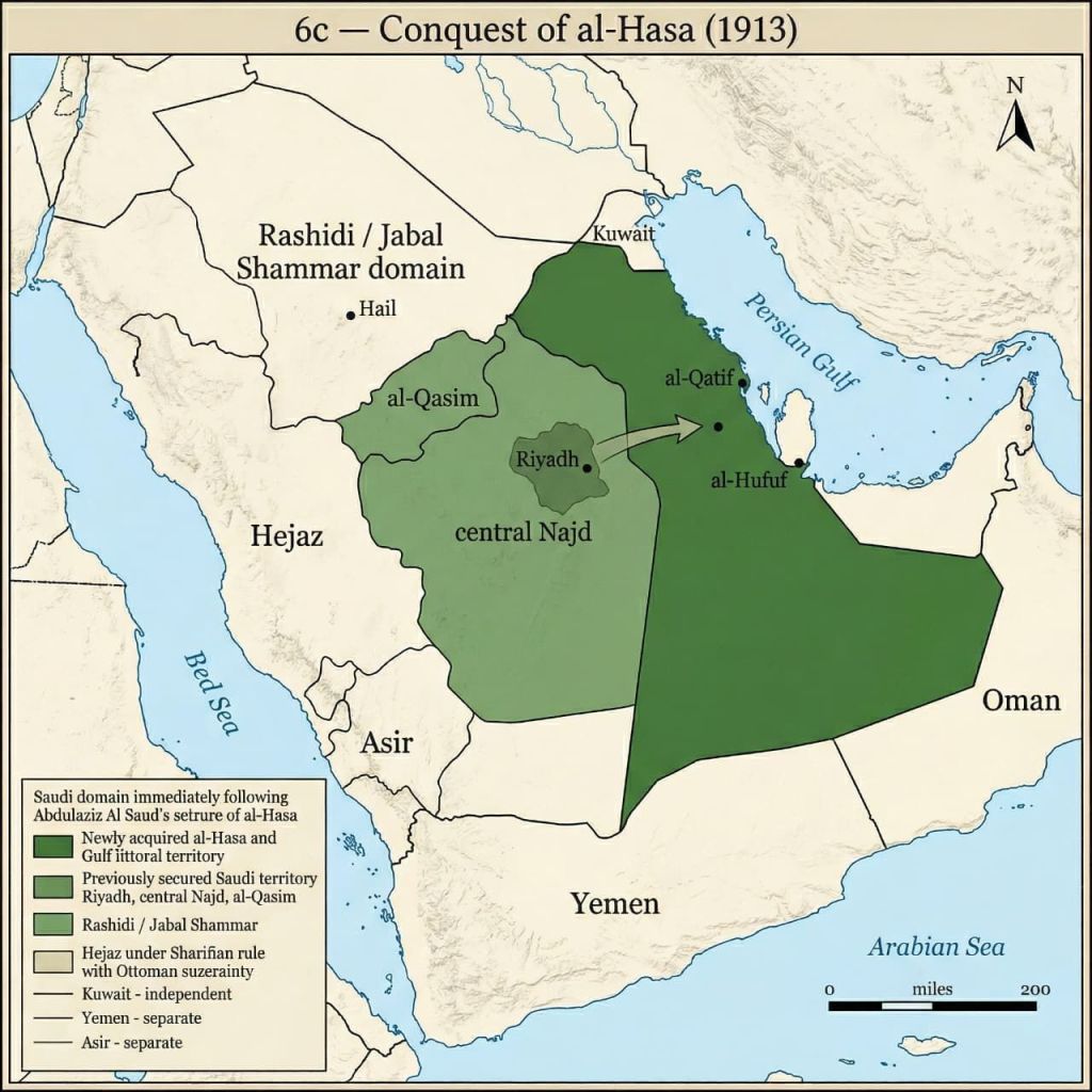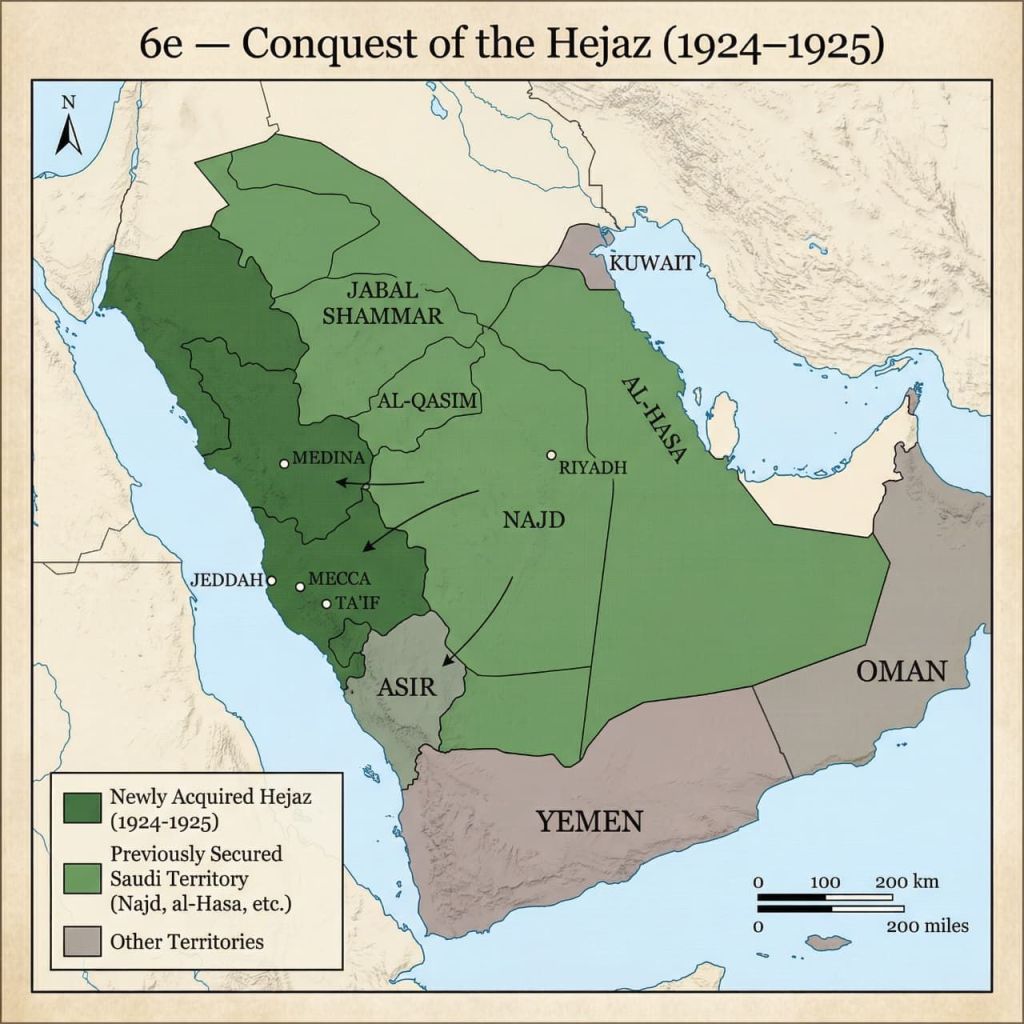The map 12 (6e) shows the capture of the Hejaz and the transfer of the holy cities to Abdul Azeez Aal Saud. Sharif Husayn ibn Ali, (the Sufi) Governor of Makkah (under the Ottomans) had rebelled against the Ottomans in the Arab Revolt of 1916 and made himself King of the Hejaz. But by the mid-1920s, the balance of power in Arabia had changed. Abdul Azeez, advancing from Najd with the a powerful army, struck westward; Makkah was taken in 1924, and Madinah and Jeddah were taken when their populations surrendered in 1925. With that, Husayn’s order collapsed, and Abdul Azeez emerged not just as a conqueror of territory, but as master of Arabia’s most symbolically powerful region.