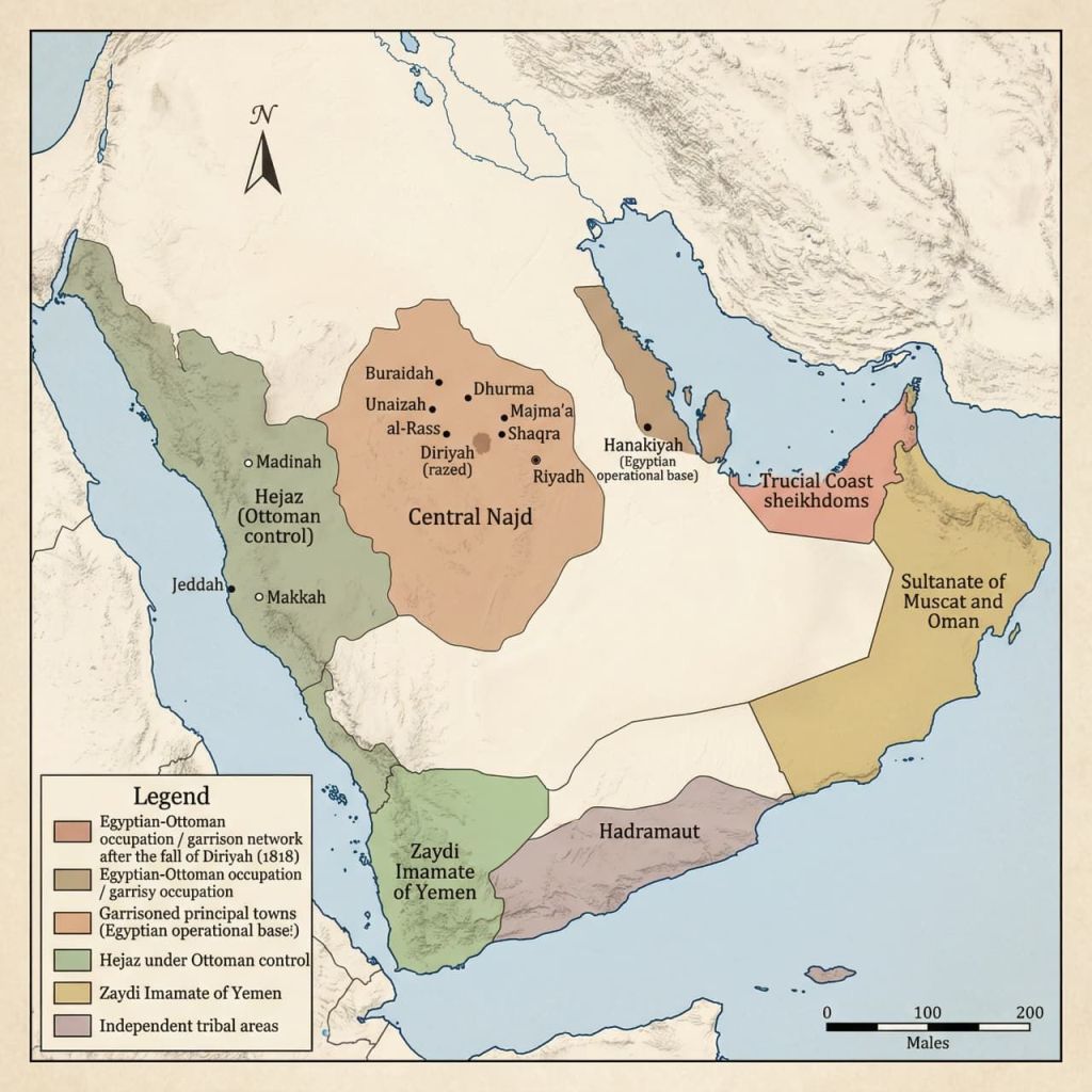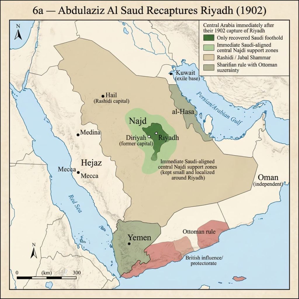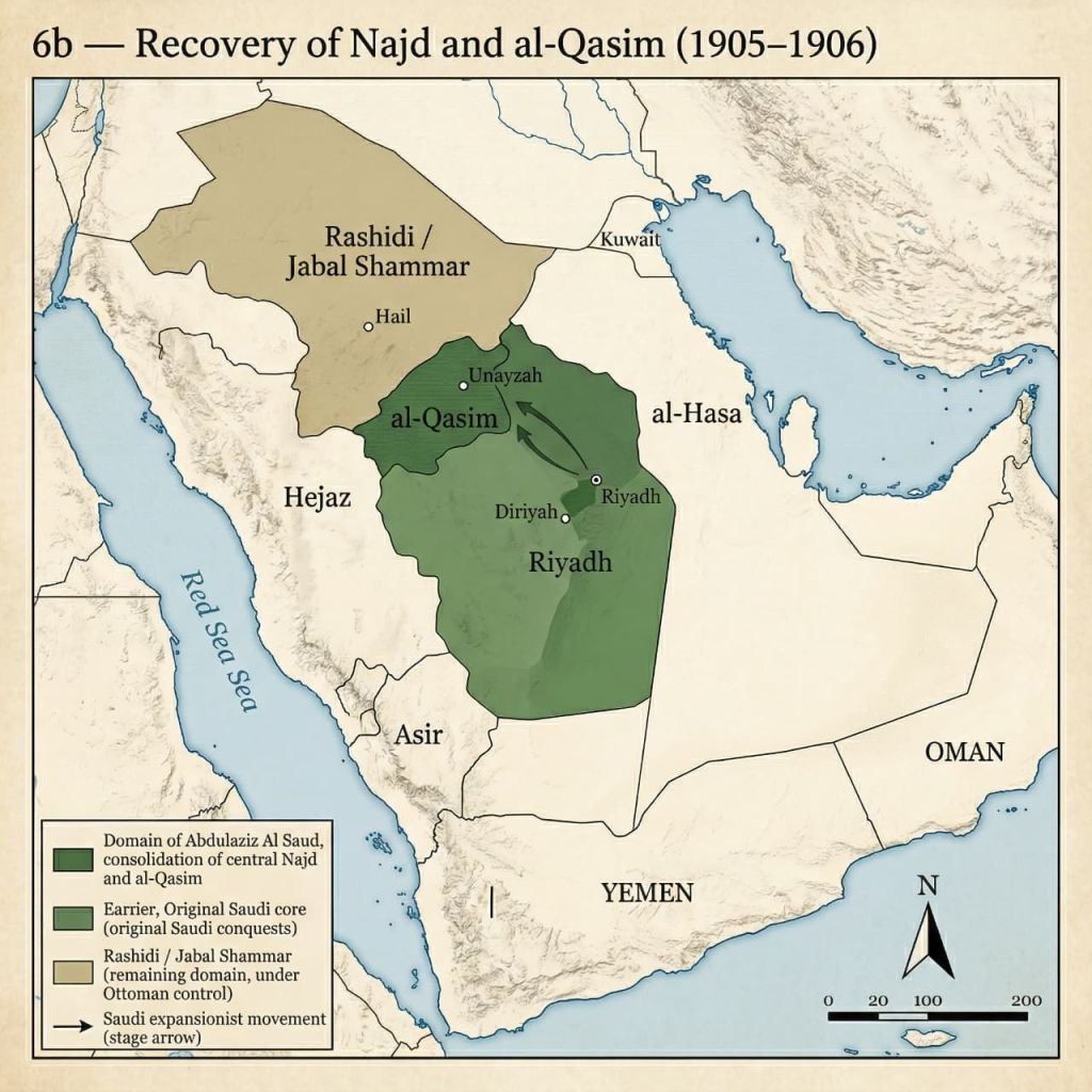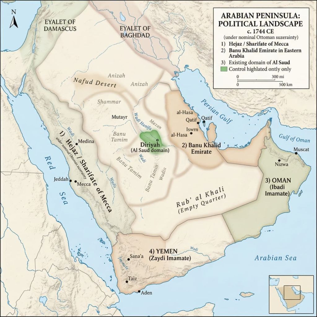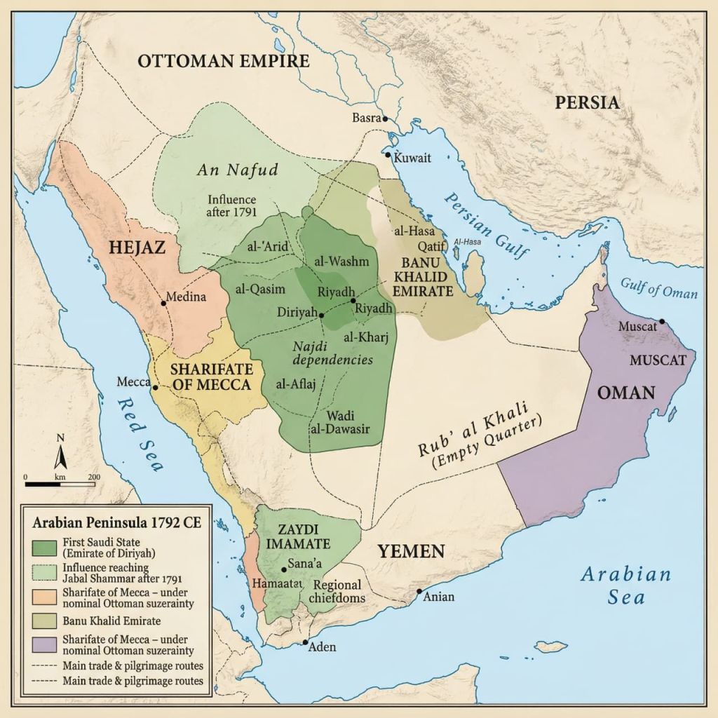 The written notes and map specifications were based chiefly on the Library of Congress country study on Saudi Arabia, the University of Leeds / White Rose thesis on the First Saudi State, and reference material from Britannica and Cambridge for chronology and regional context. To keep terminology and dynastic framing closer to indigenous Saudi usage, I also consulted Saudipedia, especially its entries on the First Saudi State, Second Saudi State, and the unification of Saudi Arabia. In that sense, the project combines AI image generation with a source-guided historical framework rather than presenting the visuals as unmediated historical originals. [See: Library of Congress Cambridge, Saudipedia: First Saudi State, Saudipedia: Second Saudi State, Saudipedia: Unification of Saudi Arabia]