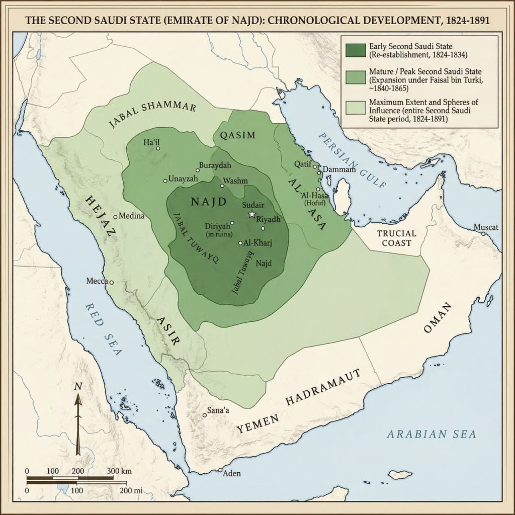 ‘The Emirate of Najd’-name of the 2nd Saudi state. This map shows the phases of the 2nd Saudi State: the early re-established core under Turki bin Abdullah Aal-Saud, the broader mature phase under Faisal bin Turki Aal-Saud, and the contracted late territory before collapse in 1891.