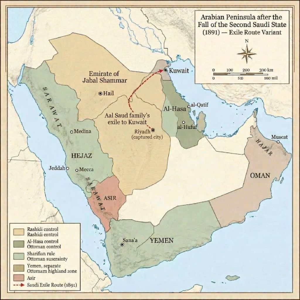 When Abdul Azeez bin Abdur Rahman Aal-Saud (born Jan 15, 1876) was around 15 years old, the Aal-Saud family escaped penniless to Kuwait to save their lives. They lived under the Kuwaiti ruler Shaykh Mubarak Al-Sabah’s protection. Helping them served Kuwait’s interests by using Abdul Azeez in the future to counter Muhammad Ibn Abdullah ar-Rashid (King of Emirate of Jabal Shammar), improving Kuwait’s regional position, and supporting Abdul Azeez’s eventual return to Riyadh in 1902 CE.