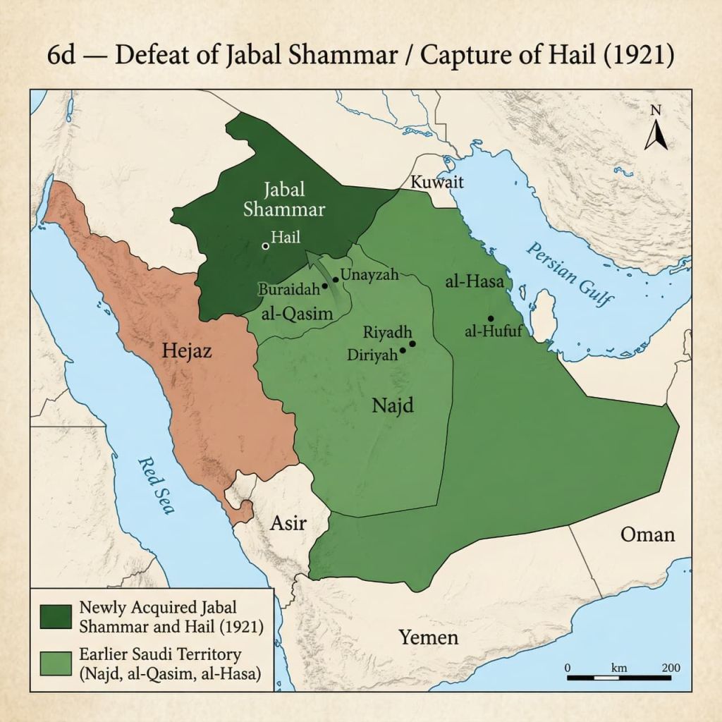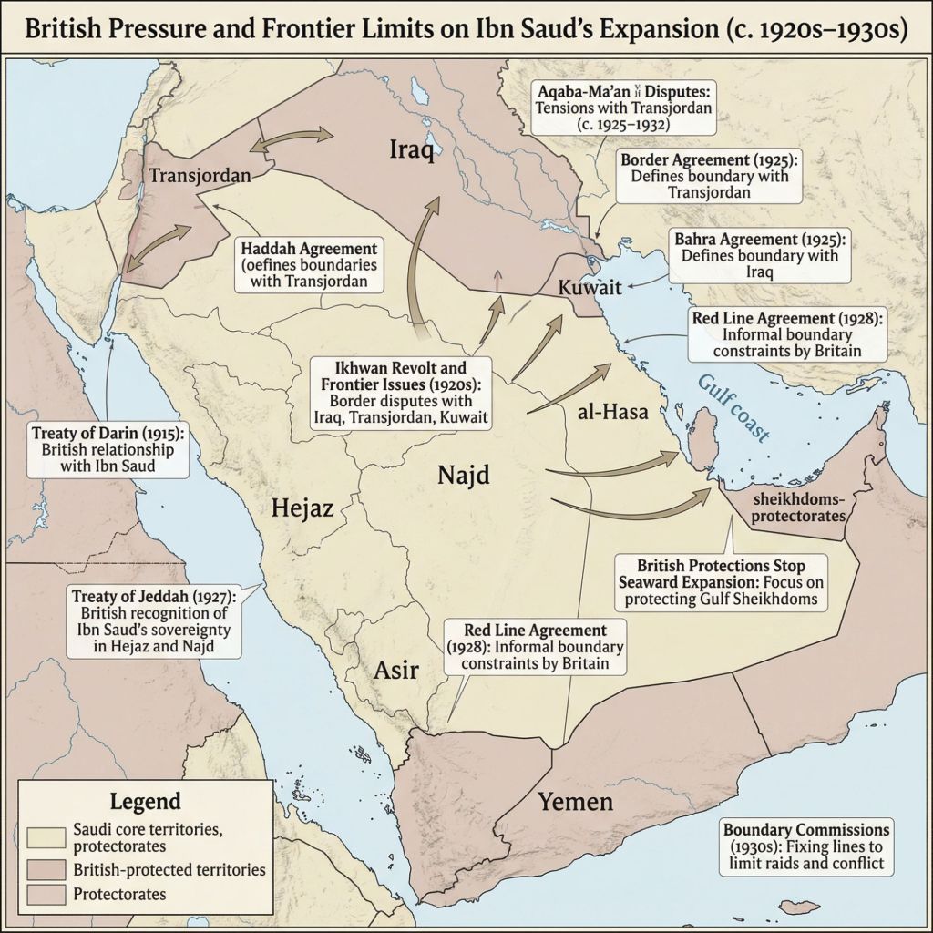 British intervention was a major reason these conquests stopped. By the late 1920s, the lands beyond Abdul Azeez’s frontier—especially Iraq, Transjordan, Kuwait, and much of the Gulf coast—fell inside the British imperial sphere or under rulers protected by British treaties. Britain opposed further Saudi expansion, enforced borders, negotiated settlements such as al-ʿUqayr with Kuwait, and in some cases used direct force: British aircraft repelled the Ikhwan army (Saudi tribal military forces, not the Ikhwan-ul-Muslimeen group) raids into Iraq, and British-backed forces later drove Saudi troops out of Al-Buraymi. This pressure, combined with Abdul Azeez’s need to suppress the Ikhwan (Saudi tribal troops under him) and stabilize his new kingdom, changed Saudi policy from frontier conquest towards consolidation of whatever they already had.