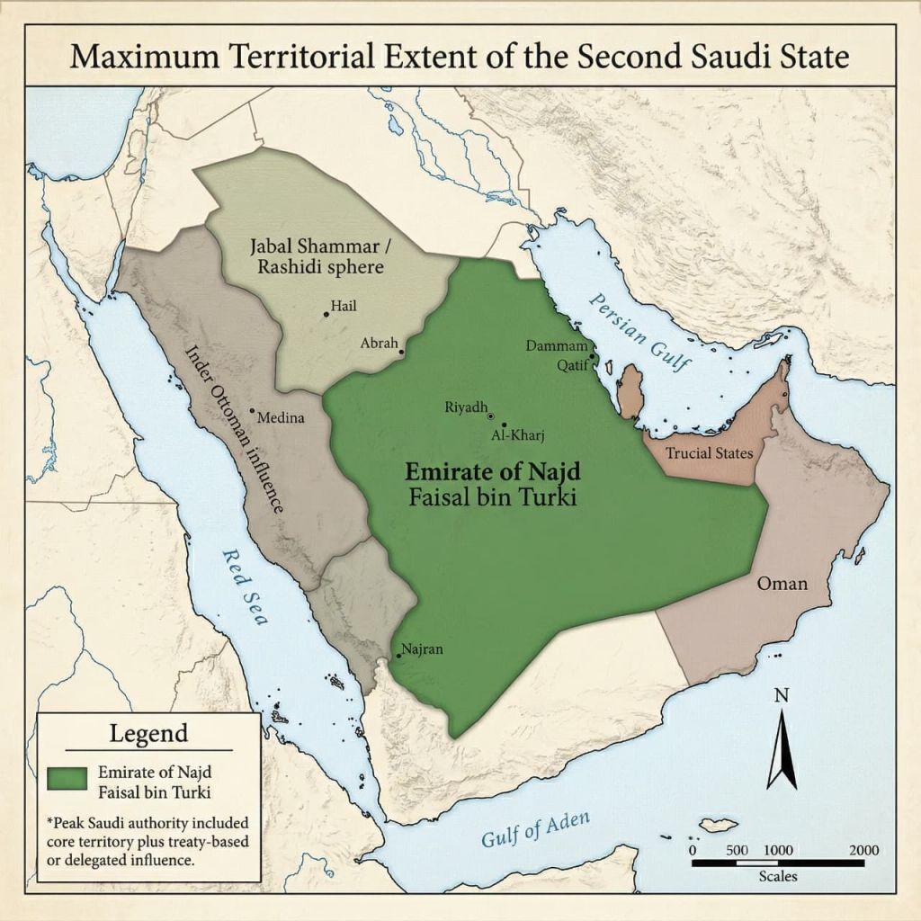 The Emirate of Najd (2nd Saudi state), maximum territories captured, under Faisal bin Turki Aal-Saud before its collapse.