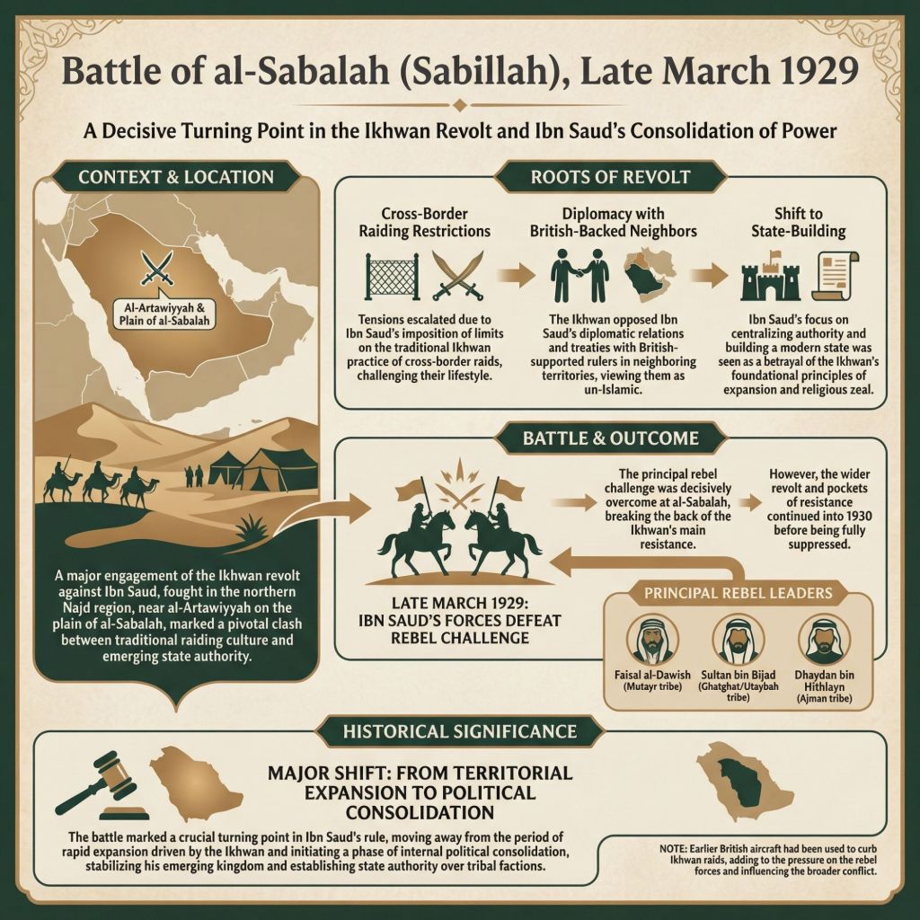 At Sabilla in 1929, the Ikhwan army and its scholars rebelled against King Abdul Azeez. King Abdul Azeez shattered their revolt and crushed the Ikhwan, ending the age of Saudi expansion by this holy-war cavalry.