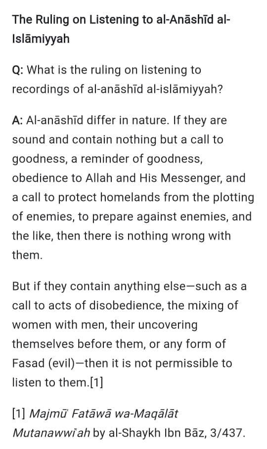 Just because Shaykh Saleh Al-Fawzan said that Nasheeds are Haram, it doesn’t become Haram. If you want to follow that opinion please follow it, but don’t throw someone out of Salafiyyah just because they don’t follow an opinion you follow. Shaykhs Ibn Baaz, Ibn Uthaymeen and Al-Albani and others from our times have allowed Islamic Anashaeeds with certain conditions. I will just share Shaykh Ibn Baaz’s Fatwa. (Shaykh Ibn Uthaymeen, Shaykh Al-Albani and Shaykh Ibn Jibreen also have similar Fatwas.)