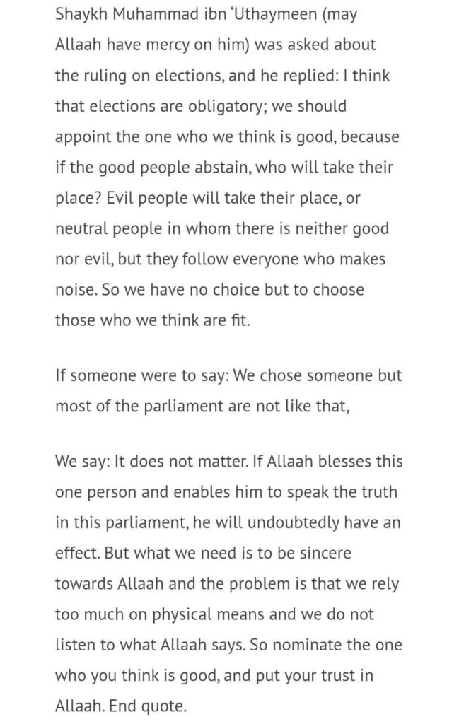 Again, it’s OK if you hate voting in non-Muslim countries. But don’t call those who support the opinion of voting as ‘deviant’ or ‘people supporting Shirk’. If you still want to call the scholars of India who support voting as non-Salafi, then use the same logic to blame Shaykhs Al-Luhaydan, Ibn Uthaymeen, Abdul Muhsin Al-Abbad, Al-Albani etc. Voting in Non-Muslim lands is a matter disputed amongst the Ulama and the scholars of Non-Muslim lands will chose what they deem fit in The light of The Quran and The Sunnah.