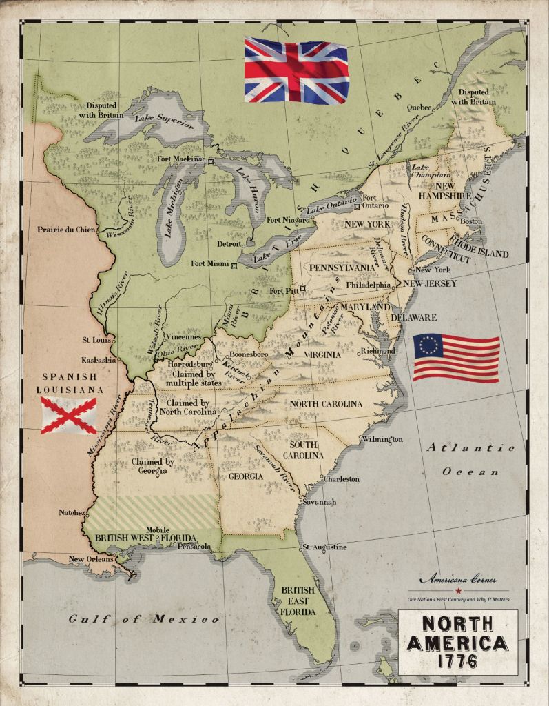 The first map of USA with 13 states. The part today called Canada was still under British control. There are still other areas at this time under French, Spanish and British occupation.