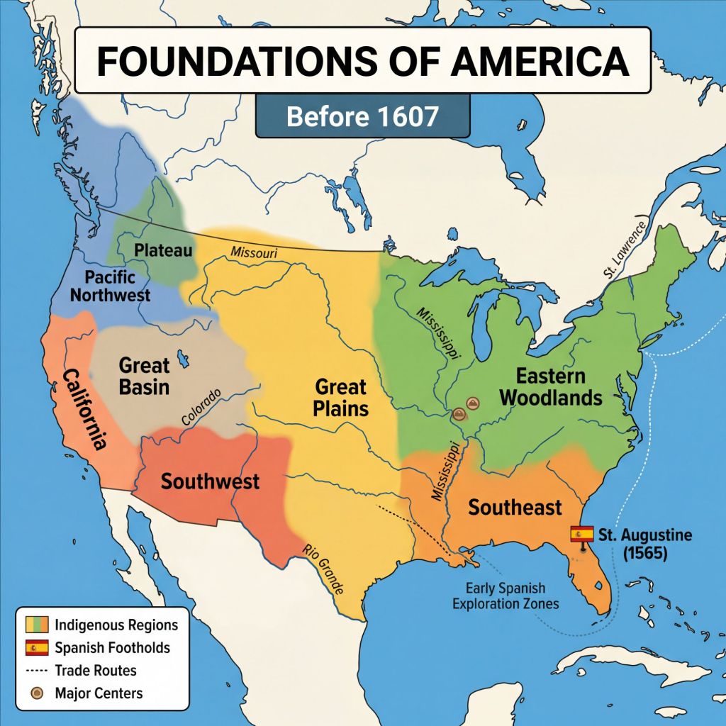 This was North America Before 1607. The various colours show different regions filled with indigenous American people (what we now call Red Indians). The Spanish colonies started settling in the East at this point.