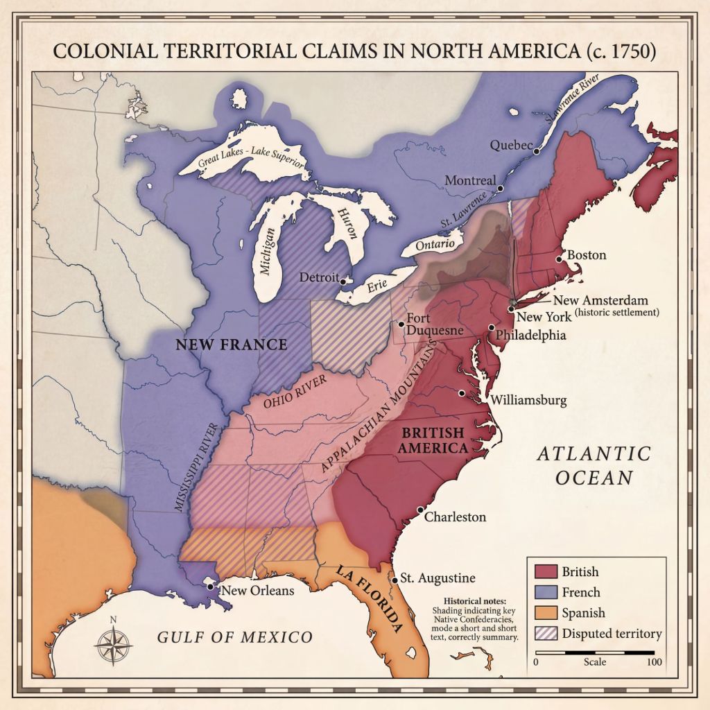 By 1750, major world powers already controlled large parts of North America. You can see the areas controlled by Spain, France and Mexico.