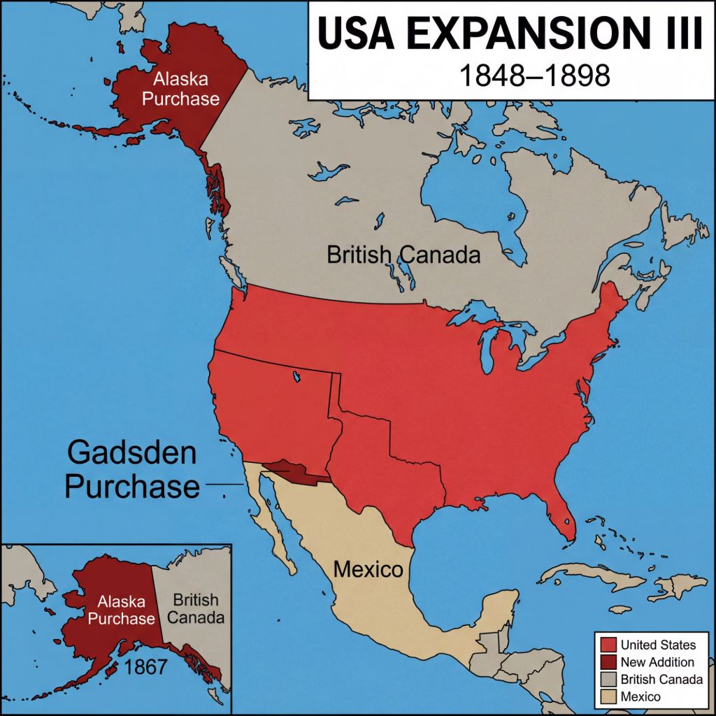 By 1898, the USA acquired land by the Gadsden Purchase, the Alaskan Purchase and capturing Hawaii.