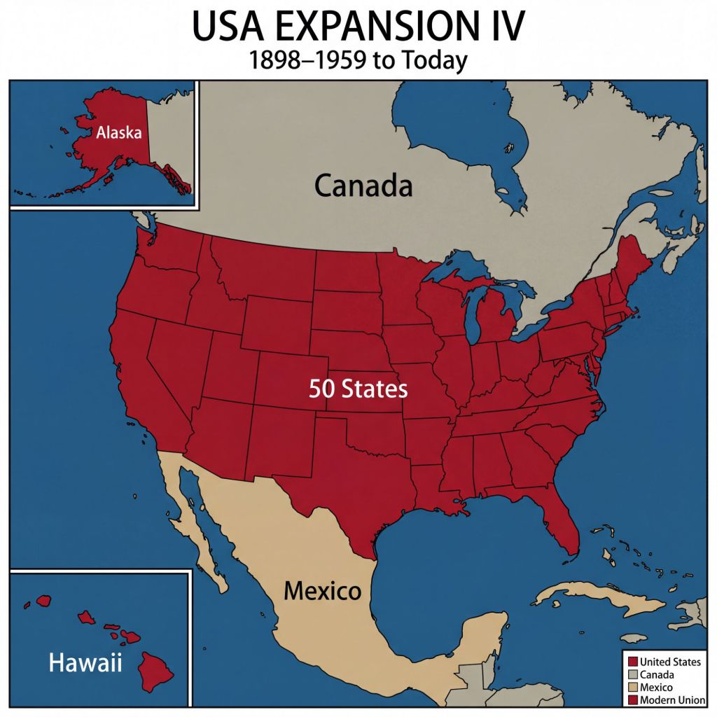 The final USA was established with fixed modern day boundaries in 1959. They tried pushing into British Canada but failed. And they couldn’t grab more from Spanish Mexico because of fixed treaties.
