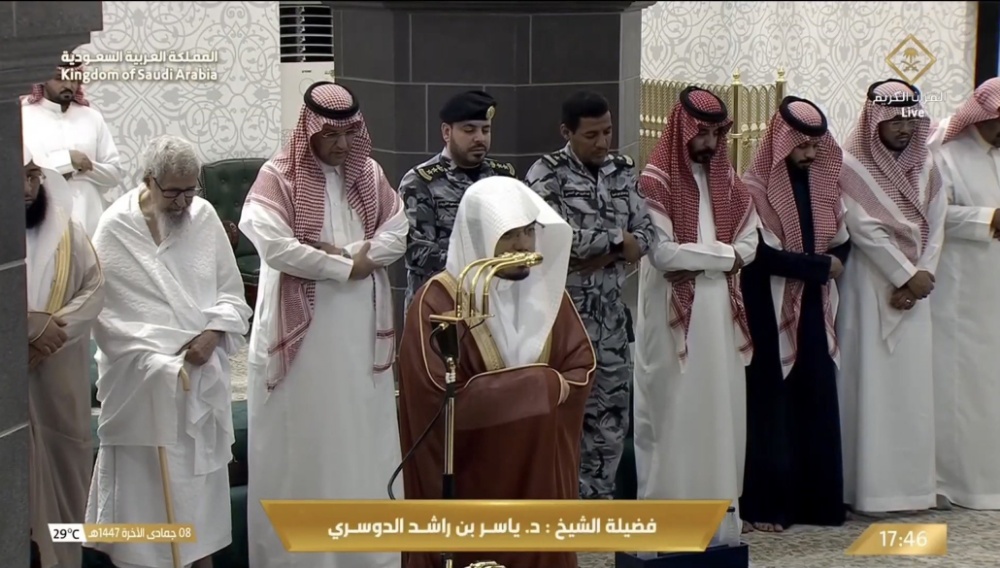 This image captures a profound moment containing several valuable Fiqhi (jurisprudential) benefits. It features one of the most senior scholars of our time, Shaykh Saleh bin Fawzan Al-Fawzan (may Allah preserve him), praying in the state of Ihram behind the younger Imam of Masjid Al-Haram, Shaykh Yasser Ad-Dosary (may Allah preserve him). (Maghrib Salah, 29th Nov 2025, Source: @insharifain on Twitter)