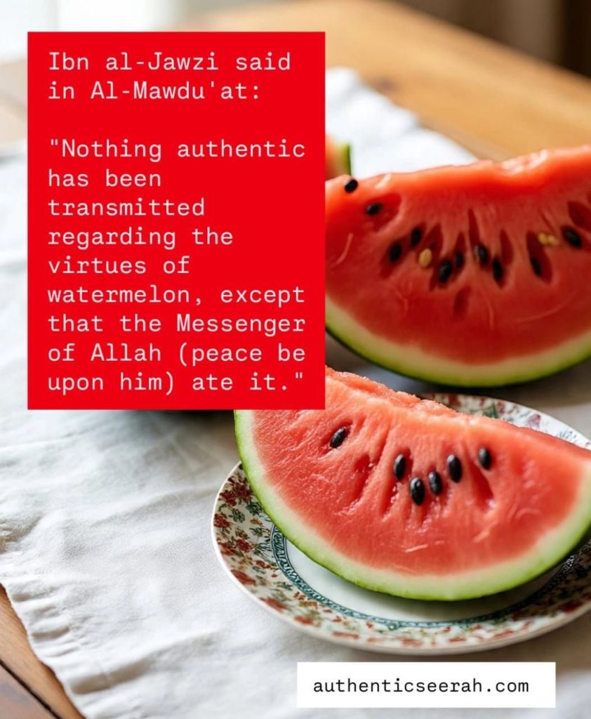 Ibn al-Jawzi said in Al-Mawdu’at: “Nothing authentic has been transmitted regarding the virtues of watermelon, except that the Messenger of Allah (peace be upon him) ate it.”